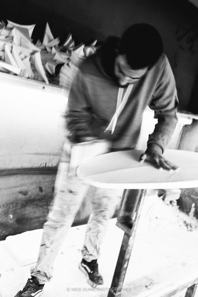 Ce nouvel atelier 2.0 permet de fabriquer plus de 300 planches par an, quasiment toutes sur mesure. Mat peaufine ses shapes au fur et à mesure des années et créé une vraie relation avec ses clients surfeurs. C’est ce qui intéresse le shaper. Le travail avec des surfers de renom permet aussi d’avoir un retour très précis sur les shapes et d’avancer rapidement vers des designs aboutis.